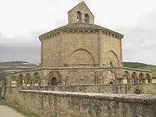 The Church of Saint Mary of Eunate is a 12th-century Catholic church of Romanesque construction located about 2 km south-east of Muruzábal, Navarre, Spain, on the Way of Saint James. Its origins are disputed due to lack of documentation. Its octagonal plan and the fact that it is not located in a present-day village or town but in the countryside contribute to its enigmatic nature. It is a site on the French Way path of the Camino de Santiago.
