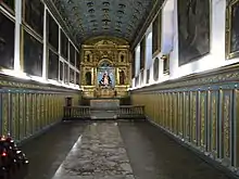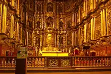 It is currently the oldest preserved church in Bogotá, it is located on the northwest corner of Avenida Jiménez with Carrera Séptima, diagonal to the TransMilenio's Museo del Oro station. This building is the one with a Mudéjar ceiling, one of the best in New Granada, the altarpiece is the most representative of the Viceroyalty of New Granada made between 1593 and 1611,[1][2] this altarpiece has Renaissance elements, the altarpiece has grotesque elements in its first body in the second body contains all the saints with their attributes and is topped by all the apostles; in the center at the top is the eternal father with one hand leading the world and with the other pointing to the Franciscans.