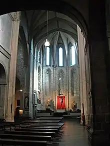 Typically for the late Gothic style dominant at the time, the church has a single nave, with side chapels opening between buttresses, with a raised choir and transept. At the ends of the transept are two stone portals from the workshop of Simón de Colonia, dating to c. 1490. The left one gives access to the Chapel of the Crucifix, while the right one led to the funerary chapel of Alonso de Burgos.
