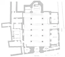 The church was decorated in 1657 by the brothers Pedro and Miguel de Borja.[3] The temple has a rectangular floor plan, with an extension of the chancel and two bodies, also rectangular, attached to the wall of the Epistle. The interior has three naves divided into six sections by 10 Tuscan columns of red marble, over them we find semicircular arches that support barrel vaults with false lunettes in the central nave and groin vaults in the lateral ones. Over the last two bays of the central nave, in front of the presbytery, there is a dome on pendentives, illuminated by two lateral oculi. The space of the presbytery is covered by a barrel vault with lunettes.