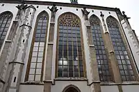 Late Gothic construction of the parish church started with building up the choir in 1446. The builder in the late 1450s was probably Hans from Brno according to scientific research. The main problem is surely to find out the date when construction began, i.e. the date of establishing the East-oriented presbytery. There is a document about a gift for the construction of the chancel from the year 1469 and the latest research comes with differing opinions as to when construction on the presbytery began. It should date according to documents from the half of the 15th century. This year probably prefers to the finishing of the construction of the chancel. Another opinion puts forth the idea about the earlier construction of the oldest part of the presbytery. This idea is supported by some architectonic details, for example the axial placing of the buttress which recalls Petr Parléř's construction at the Southern hall in Saint Vitus cathedral in Prague and in the presbytery of Saint Bartholomew's in Kolín upon Elbe. Also the structure of the wall profile between the windows and the shape of the window tracery repeats some of Parléř's characteristic motifs and possibly floral ornaments and beautiful gargoyles at the top of the buttresses which are close to work from Parléř's area. It could be hardly made as special kind of historicism in the half of the 15th century. It is possible to consider the origin of the presbytery and so the project of the new church at the end of the 14th century. Norbert Nussbaum pointed out to details of the shaft work, which passes through the windows jambs and the compound piers. It shows knowledge of the forms, which were used in the lodge at the Cathedral of St. Stephan in Vienna, when there was a master Lorenz Spenning.[1]