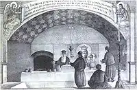 To the right of the parekklesion and connected to it by a door was the bath where the Emperor immersed himself. It was made up of three parts: the robing room where he undressed, the kólymbos (pool for immersion) and the hall of Saint Photinos. Adorned with icons, the kolymbos consisted of a large room surmounted by a dome with the pool in the middle; water flowed into the pool from the hands of a marble statue of the Virgin. An image of Saint Photinos decorated the centre of the dome.[16] Each year, on August 15 (the feast of the Dormition), after the adoration of the Mafórion (holy veil) of the Virgin, the Emperor plunged three times into this sacred pool.[16]