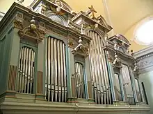 The baroque façade has a semicircular gable, a large central portal and two smaller side portals, all in the style of the late Renaissance/early Baroque. Above the central portal is a rose window.
