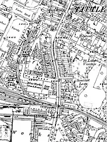 St Luke's Church (centre) within High Orchard, Gloucester, on a c.1880 Ordnance Survey map.