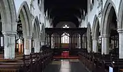 The late 14th century chancel screen (or rood screen), which is in the same line with those of the chapels, is a fine one in carved oak of three bays, and two half bays at the north and south ends. The screen in the north aisle is 15th century with four narrow bays on either side, while that in the south aisle dates to about 1480, with three bays on either side of the doorway.[10] The 15th-century roof of the chancel has moulded wall plates and ties, trusses, with tracery in the spandrels. The wall plates rest on corbels with carved heads. The Norman and Beard organ was installed in 1913 and was restored in the 1990s.