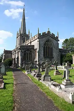 It consists of a nave, chancel and has north and south aisles. The church is unusual in Somerset in having a spire, which rises above a three-stage tower which is supported by diagonal buttresses.[2] St Mary's includes a peal of six bells, the earliest dated 1613,[lower-alpha 1] and an organ by Gray and Davison from 1837.[3]