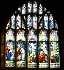 The interior contains 17 stained glass windows of varying sizes. Much of the glass is from the late 19th century although the Medieval Window includes fragments of glass from the 15th century. During the Second World War it was stored in a local clay mine to protect it from bomb damage. The windows include designs by Sir John Ninian Comper, Clayton and Bell and Hardman & Co. The east window, which is the largest, was donated by the Wilson family in 1870, and depicts the nativity, baptism, crucifixion, resurrection and ascension of Christ. A window on the west wall was donated by the Dixon family in 1930. The family had been the owners of the Spring Grove paper mill in Oughtibridge since 1871. The main west window is situated in the ringing chamber of the tower. It was a gift of James Wilson Rimington-Wilson (182277) of Broomhead Hall and depicts Saint Nicholas and Saint Cuthbert.[4] It is one of ten windows in the church attributed to William Francis Dixon (18481928) of the Clayton & Bell company.