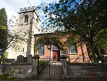 In 1782 the medieval nave, chancel, porch and south aisle were demolished.[1] The remaining west tower and north aisle were added to with a red brick wide square nave and polygonal chancel that ends in an apse. Some of the stone from the demolished building was used in the new part of the church as a wall between the nave and chancel. The new part of the church was built higher than the older part with steps leading down to the medieval north aisle. The small vestry window in the north aisle was created from a doorway in the original church. The four bells were recast in 1923 and two bells were added in 1928.[4] A further two bells were added in 1999 to make a ring of eight bells with tenor weight of eight and three quarter hundredweight.[5]
