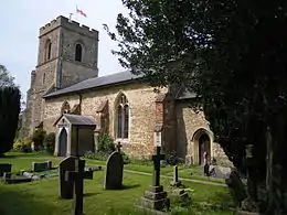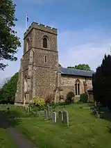 The oldest part of the church is the south end of the nave and the Norman clunch chancel arch. The tower was built in the 15th century and the nave was extended at that time to connect with it and the walls of the nave were heightened. The windows and porch also date from that time, as do the older pews and the font.[6] In 1814 the north doorway was blocked up and the coat of arms which now hang over the south door replaced an earlier larger one. The pulpit dates from the 17th century.[1]