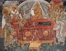 Next to the apse is a mural of Saint Cyril of Alexandria, captioned as "Saint Cyril the Philosopher", the 9th-century missionary to the Slavs.[3] Although the position and iconography of the portrait clearly identify it as an image of Cyril of Alexandria, the caption hints that the local population confused the two saints and Cyril the Philosopher was still well-remembered at the time.[1] Other images painted in the church include these of the Dormition of the Mother of God (above the entrance), the Transfiguration of Jesus (under the vault), John Damascene, Cosmas of Maiuma, Archangel Michael (south of the entrance), Saint Constantine and Saint Helena (right of the entrance).[3]