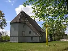 Current wooden church was built in 1752 and consecrated by Bishop of Samogitia Antoni Dominik Tyszkiewicz (Lithuanian: Antanas Domininkas Tiškevičius) on 26 April 1761.[4] It was renovated in 1880. During the Second World War, in 1944, the church suffered great losses because its tower was destroyed and its wooden belfry was burned.