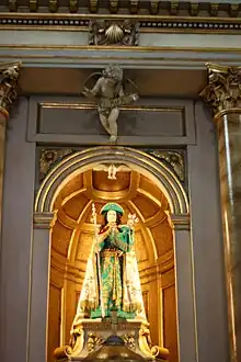 Inside the church, the rectangular presbytery is covered by a groin vault. The main altarpiece, of neoclassical style, was made in 1789 following the style of Melchor de Prado,[20] although it was modified by his brother Manuel and Juan Pernas Gambino. It ends in a pediment with a relief of the flight into Egypt[21] and the image of the Pilgrim Virgin, a 19th century carving,[22] with the Child Jesus in her arms, both dressed in short cloak, pilgrim's staff and carrying a gourd. The paintings of Santa Clara, by Polanco and a copy of the Virgin of San Onofre in Rome by Peruzzi stand out. Also noteworthy is the holy water font in the vestibule, configured with a shell of the Tridacna mollusc brought from the Pacific by Méndez Núñez. The crystal chandelier inside the church is a jewel from the end of the 19th century, weighing 250 kilos and measuring 2.50 metres in height.[23]
