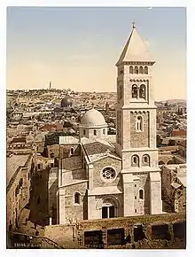 The Lutheran Church of the Redeemer (Hebrew: כנסיית הגואל, Arabic: الكنيسة اللوثرية في القدس, German: Erlöserkirche) is the second Protestant church in Jerusalem (the first being Christ Church near Jaffa Gate). It is a property of the Evangelical Jerusalem Foundation, one of the three foundations of the Evangelical Church in Germany (EKD) in the Holy Land. Built between 1893 and 1898 by the architect Paul Ferdinand Groth following the designs of Friedrich Adler, the Church of the Redeemer currently houses Lutheran congregations that worship in Arabic, German, Danish, and English. The Church, together with the adjoining provost building, is the seat of the Provost of the German Protestant Ministries in the Holy Land ("Evangelisch in Jerusalem"). It also serves as the headquarters of the Bishop of the Evangelical Lutheran Church in Jordan and the Holy Land, since this Arabic-speaking (Palestinian) church became independent from the German provost in 1979.[1]