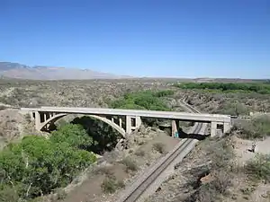 In 1920, the Arizona Highway Department began construction on a section of the Borderland Highway in southeastern Arizona.[1] The Borderland Highway was part of the larger Dixie Overland Highway, Bankhead Highway and Old Spanish Trail auto trails, which were important early transcontinental highways.[4] The Highway Department received financial aid for the project from the federal government under Federal Aid Project Number 18 as well as a Pima County bond issue and the Cochise County Road Fund. As part of the highway construction, the Highway Department needed to build a large bridge over a chasm known as Ciénega Canyon, a natural feature of Ciénega Creek, near the town of Vail. Running parallel through the canyon with the creek was the main line of the Southern Pacific Railroad (now part of the Union Pacific Railroad).