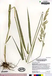 Cinna bolanderi is a species of grass known by the common names Bolander's woodreed and Sierran woodreed. It is endemic to the Sierra Nevada of California, where it grows in meadows and forest, especially in moist areas. It can reach two meters in height and has a spreading inflorescence of spikelets. It blooms in late summer and fall.