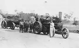![]() John Lennox and men taking steam engines to the mercury mines at Cinnabar, circa 1935 | |||||||||||||||