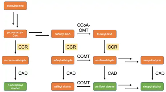 - ↑ Chabannes M, Barakate A, Lapierre C, Marita JM, Ralph J, Pean M, Danoun S, Halpin C, Grima-Pettenati J, Boudet AM (November 2001). "Strong decrease in lignin content without significant alteration of plant development is induced by simultaneous down-regulation of cinnamoyl CoA reductase (CCR) and cinnamyl alcohol dehydrogenase (CAD) in tobacco plants" (PDF). The Plant Journal. 28 (3): 257–70. doi:10.1046/j.1365-313x.2001.01140.x. PMID 11722769.