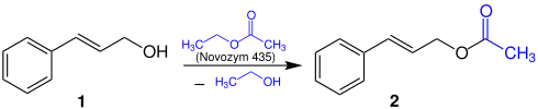 Since acetaldehyde has an unfavourable deactivating effect on the lipase used in the synthesis, ethyl acetate can be used as reactant instead of vinyl acetate. In this transesterification reaction cinnamyl alcohol 1 reacts with ethyl acetate to form cinnamyl acetate 2 and ethanol. This synthesis requires the lipase Novozym 435, and is performed in a solvent-free system. The reaction is as follows:[12]