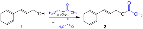 There are multiple ways to synthesize cinnamyl acetate 2. One way is the synthesis from cinnamyl alcohol 1 and vinyl acetate. This reaction is catalyzed by the enzyme triacylglycerol ester hydrolase, which is a lipase that is very specific towards the ester bond. The byproduct of this reaction is acetaldehyde. The reaction equation for this reaction is:[18]