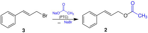 Cinnamyl acetate 2 can also be synthesized via a non-enzymatic reaction. An example of such a reaction is one with the use of cinnamyl bromide 3 and sodium acetate as reactants. Since these compounds are immiscible substrates, solid-liquid phase transfer catalysis (PTC) can be used, using quaternary ammonium bromide as a phase transfer catalyst. This is shown in the following reaction:[19]