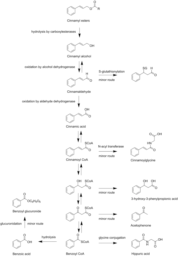 Within the cinnamyl derivatives, cinnamyl acetate belongs to the group of cinnamyl esters. After absorption from the gut, this group of compounds is first hydrolyzed to cinnamyl alcohol by carboxylesterases. Carboxylesterases are a group of enzymes. The most important enzymes within this group are the A-esterases. These are present in most body tissues, but they are prevalent in the hepatocytes. Subsequently, the cinnamyl alcohol is oxidized which leads to the formation of cinnamaldehyde. This reaction is catalyzed by human NAD+-dependent alcohol dehydrogenase. Now, there are two routes for the further biotransformation of cinnamaldehyde. The minor route of biotransformation is the S-glutathionylation. The major route, however, is the conversion of cinnamaldehyde into cinnamic acid by the enzyme aldehyde dehydrogenase. Next, the cinnamic acid is transformed into cinnamoyl CoA which is again converted to either cinnamoylglycine by N-acyl transferase or to benzoyl CoA through β-oxidation, the latter being the major route. Intermediate metabolites in the β-oxidation pathway can be converted to 3-hydroxy-3-phenylpropionic acid and acetophenone, which can be excreted via the urine. However, the conversions of these intermediate metabolites are minor routes. Finally, the benzoyl CoA is conjugated with glycine under formation of hippuric acid or it is hydrolyzed generating free benzoic acid. This can be excreted via the urine directly or after glucuronidation. Hippuric acid, which is the major metabolite, is also excreted via the urine.[5][21][6]