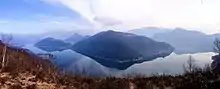 Mount Marzio is 878 meters high and on its moraine ridge sits the little Council of Marzio. From the top of the mountain, it is possible to see Switzerland and Lake Lugano.[30] The summit is accessible from two points of the village, the first one is immediately after the Madonna degli Alpini monument, the other is situated after Via Bolchini. It takes about one hour to get to the top of the peak. Remains of the trenches of the Cadorna Line are visible along this path.[31] On the top there are some antennas and two flat areas, and from one of these there is a viewpoint over Lake Lugano.[32] A geological fracture named "faglia di Marzio" sections the valley from north-west and separates Mount Marzio from Mount Derta and Mount Piambello. While Mount Derta and Mount Piambello are mainly made up of red porphyry and quartz, Mount Marzio is mainly composed of limestone of sedimentary origin.[33]