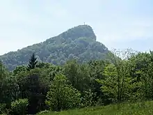 Mount Piambello is situated in the heart of the park area, south of the small town of Marzio.[21] This mountain is composed of volcanic rocks and, standing 1159 meters above sea level, dominates the Valceresio, Valganna and Valmarchirolo. From its summit there is a view of the Italian and Swiss Alps, up to the Monte Viso.[22] It is characterized by an extremely varied landscape, in which wide valleys shaped by glaciers alternate with soft pre-alpine hills and numerous waterways.[23] This mountain is of geological interest due to the Peculiarity of Sass di Bol (m.a.s.l. 982 ), a large Monolith in red Porphyry (geology). Steps carved in this huge boulder provide visitors access to reach the panoramic top.[24]