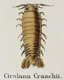 Some of the species are named for people, as C. brucei for zoologist Niel L. Bruce, who has named many isopods; C. mercuryi for musician Freddie Mercury; C. cranchii for explorer John Cranch, a friend and employee of William Elford Leach who first described the genus in 1818. The generic name Cirolana is an anagram of Carolina, named for an unknown woman called Caroline. Leach named a number of isopod genera with anagrams of Caroline or Carolina.[2][3] In the French work in which Leach proposed these names he gave each new genus a French name as well as a Latin zoological name. Sometimes - as with Cirolana - it was the French name that was the anagram of Caroline; in this case 'Cirolane'.[4][5]