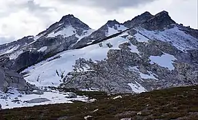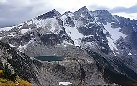 The history of the formation of the Cascade Mountains dates back millions of years ago to the late Eocene Epoch.[4] With the North American Plate overriding the Pacific Plate, episodes of volcanic igneous activity persisted.[4] In addition, small fragments of the oceanic and continental lithosphere called terranes created the North Cascades about 50 million years ago.[4] During the Pleistocene period dating back over two million years ago, glaciation advancing and retreating repeatedly scoured and shaped the landscape.[4] Glaciation was most prevalent approximately 18,000 years ago, and most valleys were ice-free by 12,000 years ago.[3] Uplift and faulting in combination with glaciation have been the dominant processes which have created the tall peaks and deep valleys of the North Cascades area.