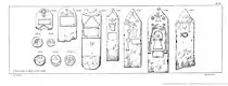 In 1861 Auguste Celestin Judas published a series of 19 inscribed steles in the Annuaire de la Société archéologique de la province de Constantine. Between 1857 and 61 more than 30 such steles had been collected by the Archaeological Society, of which a dozen in 1860 alone.[7] Judas noted that the locations of the finds had been difficult to ascertain, his understanding was as follows:[8]