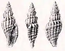 (Original description) The shell has a fusiform shape, acuminated at both ends and obtusely angled in the middle. It is somewhat obscurely banded with light and dark brown, with narrow whitish interstices, dark purplish brown between the angle and the suture. The spire is rather long and acute. The shell contains 7 whorls, angularly convex, finely spirally striated throughout and longitudinally regularly ribbed. The ribs are narrow, rather distant (12 on the penultimate whorl). The body whorl is longer than the spire, angular above, then slightly convex, attenuated towards the base, terminating in a short narrow slightly recurved rostrum. The aperture is long, rather wide in the middle, and narrower at each end. The interior is closely plicated, dark brown with a whitish median band. The columella is rather straight, recurved at the base and is furnished with numerous small plicae. The outer lip is sharp at the edge, externally thickened by a stout rounded varix. The posterior sinus is shallow, but rather wide.[2]