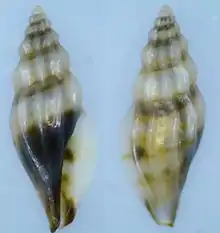 The shell has a biconic-fusiform shape. It shows 7-9 axial ribs on the later whorls. The spiral striae can only be seen under a lens. The outer lip has 9-12 plicae, with the posterior one nodiform.[2]
