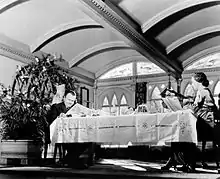 The next scenes were the El Rancho nightclub scenes and the scene in which Susan attempts suicide.[lower-alpha 7][19]: 69 Welles later said that the nightclub set was available after another film had wrapped and that filming took 10 to 12 days to complete. For these scenes Welles had Comingore's throat sprayed with chemicals to give her voice a harsh, raspy tone.[36]: 170–171 Other scenes shot in secret included those in which Thompson interviews Leland and Bernstein, which were also shot on sets built for other films.[40]