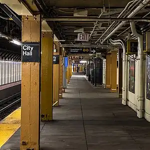 The City Hall station is a local station on the BMT Broadway Line of the New York City Subway in Tribeca and Civic Center, Manhattan. It is served by the R train all times except late nights, when the N train takes over service. The W train serves this station on weekdays only.