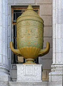 City National Bank, Galveston -- closeup of giant urns beside entryway