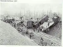Likewise, doubts have been cast on whether the photo of the accident circulated by the media was authentic and depicted the actual derailment at Ciurea. Taken, as stated, on 19 January [O.S. 6 January] 1917, it shows no trace of snow, although two distinct memoirs mention passengers surviving because they were thrown off the train into banks of snow.[15][16] As such, this photo is not dated correctly.[14] It is known that Ciurea was the site of several railway accidents during the early twentieth century, with one known incident taking place in 1925.[17] The photo may well have been taken on one of those other occasions.