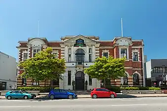 The Agricultural and Industrial Hall, also known as the Canterbury Hall, was built in 1900 at 192–194 Manchester Street.[1][2][3] The foundation stone was laid by Mayor William Reece on 14 March 1900.[4] William Clarkson and Robert Ballantyne, architects trading as Clarkson & Ballantyne, designed the building for the 50th jubilee of Christchurch, celebrating the arrival of the First Four Ships in December 1850.[3][5] The contractors were Rennie and Pearce.[4] The Canterbury Industrial Association, a branch of the New Zealand Industrial Association, was the driving force behind the building.[6] Together with the Agricultural and Pastoral Association, an Agricultural and Industrial Hall Company was formed that owned the building.[4][6] Samuel Brown, the president of the New Zealand Industrial Association, called it "possibly the finest hall in New Zealand".[6]