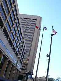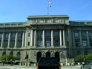 The Civic Center is a mostly governmental district in downtown Cleveland, Ohio, that is home to the 1916 erected Cleveland City Hall Building.[1] The 1925 Cleveland Public Library main branch,[2] the 1976 massive Cuyahoga County Justice Center, the 419 foot Anthony J. Celebrezze Federal Building (named after the 1953–1962 popular Cleveland Mayor),[3] the Federal Reserve Bank of Cleveland (one of only twelve in the US),[4] the historic Cuyahoga County Courthouse, the Cleveland Public Hall, the Howard M. Metzenbaum U.S. Courthouse which abuts Public Square, and the city-owned greenspace Willard Park which is home to the Free Stamp.