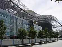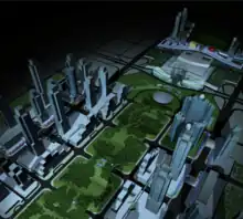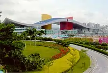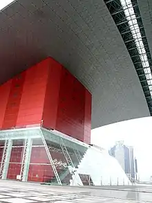 Civic Center or Citizens' Center (Chinese: 市民中心) is a government building in Shenzhen, China. It is located within the Futian Central Business District and was constructed at a cost of CNY 2.172 billion.[3] The civic building was the centerpiece plan for the Shenzhen Futian Central District Master Plan[4] and is "attentive to traditional asian themes and traditions".[5] The overall city plan is based on a central axis, which stretched 2km from Lianhua Mountain in the north, through the Civic Center, and to the Exhibition Center in the south. The land area of the master plan is roughly 100 city blocks and the projected total floor space of the plan is "5 times the size of the original World Trade Center Towers".[5]