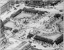 After San Francisco was selected in 1911 to host the 1915 Panama–Pacific International Exposition, numerous civic improvements were proposed, and a commission was set up to judge entries for a City Hall design competition. The jurors on the commission were John Galen Howard, Frederick W. Meyer, and John Reid, Jr.[12] An early design by A. Lacy Warswick, a city architect, called for twin fountains along the north–south centerline of the plaza.[13]: 12–14