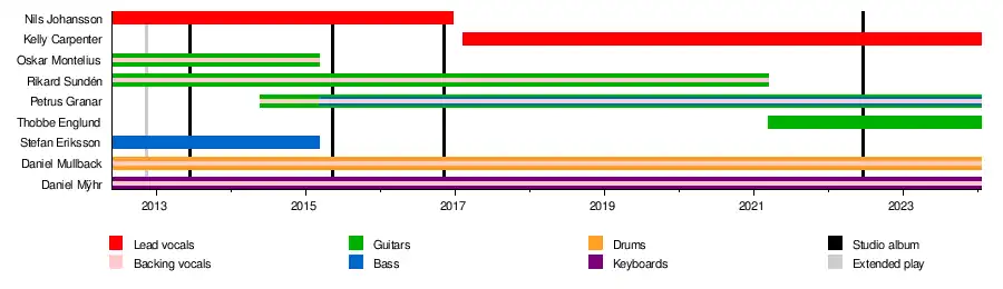 On 12 March 2021 the band announced that Thobbe Englund has replaced Rikard Sunden. Sunden had been charged and convicted in a Swedish court of sexual abuse of an eight-year-old girl, as well as of possession of child pornography.[7] Sundén, who changed his legal name to Johan Andersson, has separated from his wife, Sigrid.