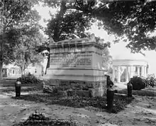 Many sources often incorrectly state that the monument was constructed in the middle of the Lee flower garden (often mischaracterized as a "rose garden"). However, the monument is just west of the flower garden, in what was once a grove of oak and elm trees.[1]