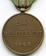 The Civilian Resistance Medal is a circular 39mm in diameter bronze medal. Its obverse bears the relief image of the torso of a man breaking free of chains around his wrists, a woman stands behind him and slightly to his left. The reverse bears the relief inscription in Latin "RESTITERUNT" meaning "THEY RESISTED" with the years "1940" above and "1945" below. The reverse has a slightly raised border.[1]