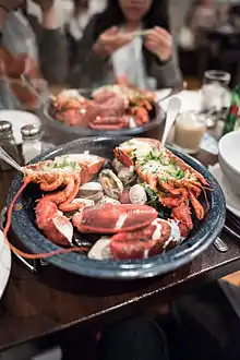 The clambake or clam bake, also known as the New England clambake, is a traditional method of cooking seafood, such as lobster, mussels, crabs, scallops, soft-shell clams, and quahogs. The food is traditionally cooked by steaming the ingredients over layers of seaweed in a pit oven. The shellfish can be supplemented with vegetables, such as onions, carrots, and corn on the cob. Clambakes are usually held on festive occasions along the coast of New England, and at fundraisers and political events. Some restaurants and caterers offer clambake-style food.