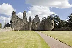 - Tolquhon Castle, four miles east of Oldmeldrum, Aberdeenshire, is a ruinous keep and courtyard castle.[22] The original castle was built by the Prestons of Craigmillar, but it passed by marriage to the Forbeses in 1420, and they completed the castle.[22] Sir Alexander Forbes, sixth laird of the castle, was killed at the Battle of Pinkie Cleugh in 1547.[22] The present castle was built by William Forbes, the seventh laird.[22] The tenth Forbes laird of Tolquhon saved Charles II of England's life at the Battle of Worcester in 1651.[22] In 1716 the Forbeses sold the castle to the Farquhars to help cover their losses in the Darien scheme, but the eleventh Forbes laird had to be forcibly removed from the castle by a detachment of soldiers in 1718.[22]