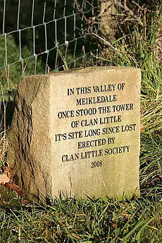 Marker for the now-gone tower of Clan Little, Meikledale Valley