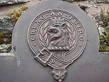 The crest badge suitable for members of Clan to wear consists of the heraldic crest and slogan. The crest is: A lion's head erased Sable crowned with an antique crown of six (four visible) points, between two branches of laurel issuing from the Wreath at either side of the head both Proper Or. The slogan within the crest badge is CREAG AN TUIRC, which translates from Scottish Gaelic as "The Boars Rock".