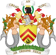 Crest: A lion's head erased Sable crowned with an ancient crown of six (four visible) points Or, between two branches of laurel issuing from the Wreath at either side of the head both Proper.