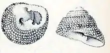 | Drawing showing two views of a shell of Clanculus personatus | |
