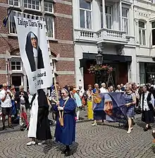 On 2 February 1844, Fey established the Sisters of the Poor Child Jesus in Aachen, as a means of leading children to Jesus Christ and educating children in a religious environment. Around 1835 she started to read the works of Teresa of Ávila and professed a desire to become a Carmelite nun. In 1841, however, her spiritual advisor Wilhelm Sartorius motivated her to instead read the works of Francis de Sales for greater theological inspiration.[1] Fey made her vows as a nun in 1850. Her order received diocesan approval on 28 January 1848 from the Archbishop of Cologne and a papal decree of praise from Pope Pius IX on 11 July 1862, with full papal approval for the order issued by Pope Leo XIII on 15 June 1888.[1] The Rule of her order would be based on the teachings of Augustine of Hippo. Fey served as the order's first superior general from its founding until her death despite her frail health and frequent bouts of illness.[2] In 1875, the Kulturkampf forced her and the order to relocate to the Netherlands where she remained until her death in May 1894. After her death a devotional cult began at the site of her grave in Simpelveld.[2]